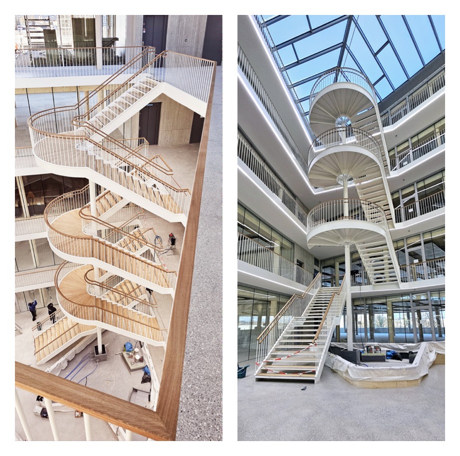 Wir durften für das moderne Dienstleistungsgebäude BERN131 eine beeindruckende Wangentreppe mit halbrunden Podesten realisieren. Mit einer Konstruktionshöhe von 16.6 m erstreckt sie sich über fünf Stockwerke und ruht auf einer zentralen Stahlstütze. Vor Ort wurden fertige Elemente präzise ein-